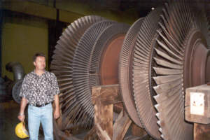 Die Schaufelräder einer (gerade zerlegten) Niederdruckturbine. Ihr ist in zusammengebautem Zustand noch eine Hochdruckturbine vorgeschaltet. |